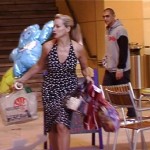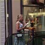 Carefully scored, alarm clocks rang every ten minutes, signalling a change of role from slowness to speed, with each performer alternating from one to the other. Activities included loitering around shop windows, dragging a 2-D husband around the shops, sitting in a shop, running whilst burdened with children’s balloons and bags, walking a tortoise (sadly not a real one – in fact it was a wind up walking pig but as slow as a tortoise), window shopping, and changing outfits in different shops.